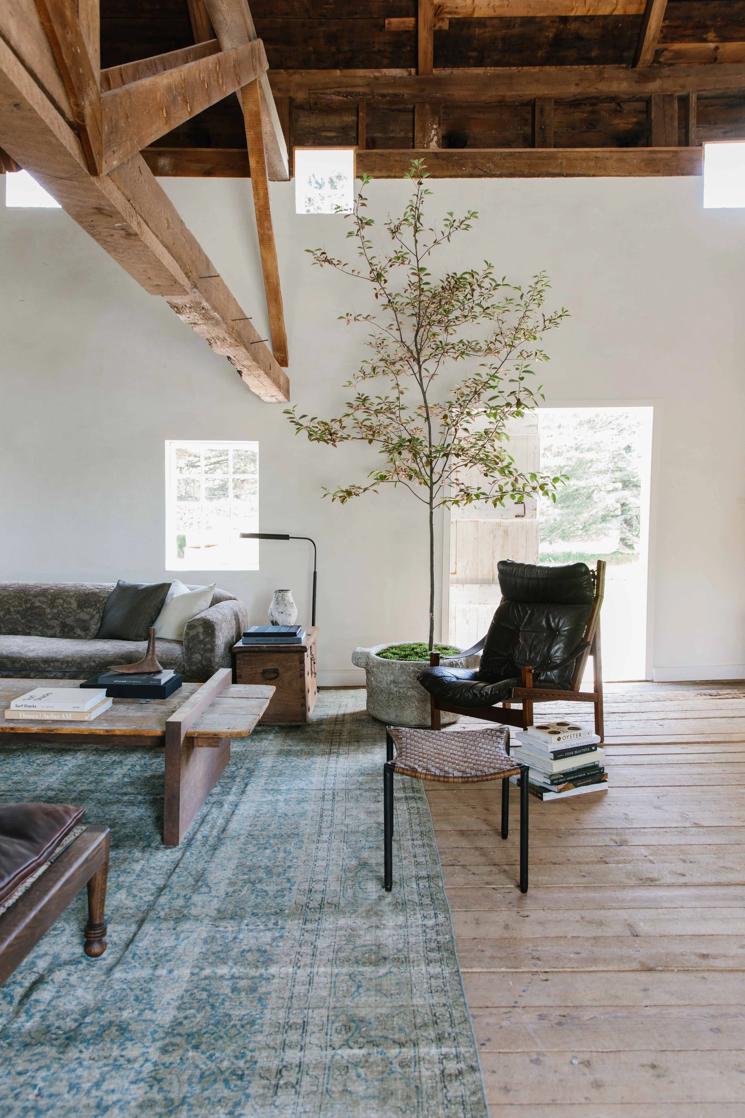 Some of the most impactful changes we’ve made to this room: a combo of plaster and exposed wood finishes creating a sort of half-dipped look we adore! We left the original woodwork, but we called in our friends at Master of Plaster. Lauren and her family travelled from Columbia, SC with their specialty mix of Slaked Lime plaster—it really took this space to the next level. We also enlarged and rebuilt the windows using traditional techniques and old ripple glass to add more light. The final product is a barn that feels modern, but still has ties to its traditional colonial heritage.