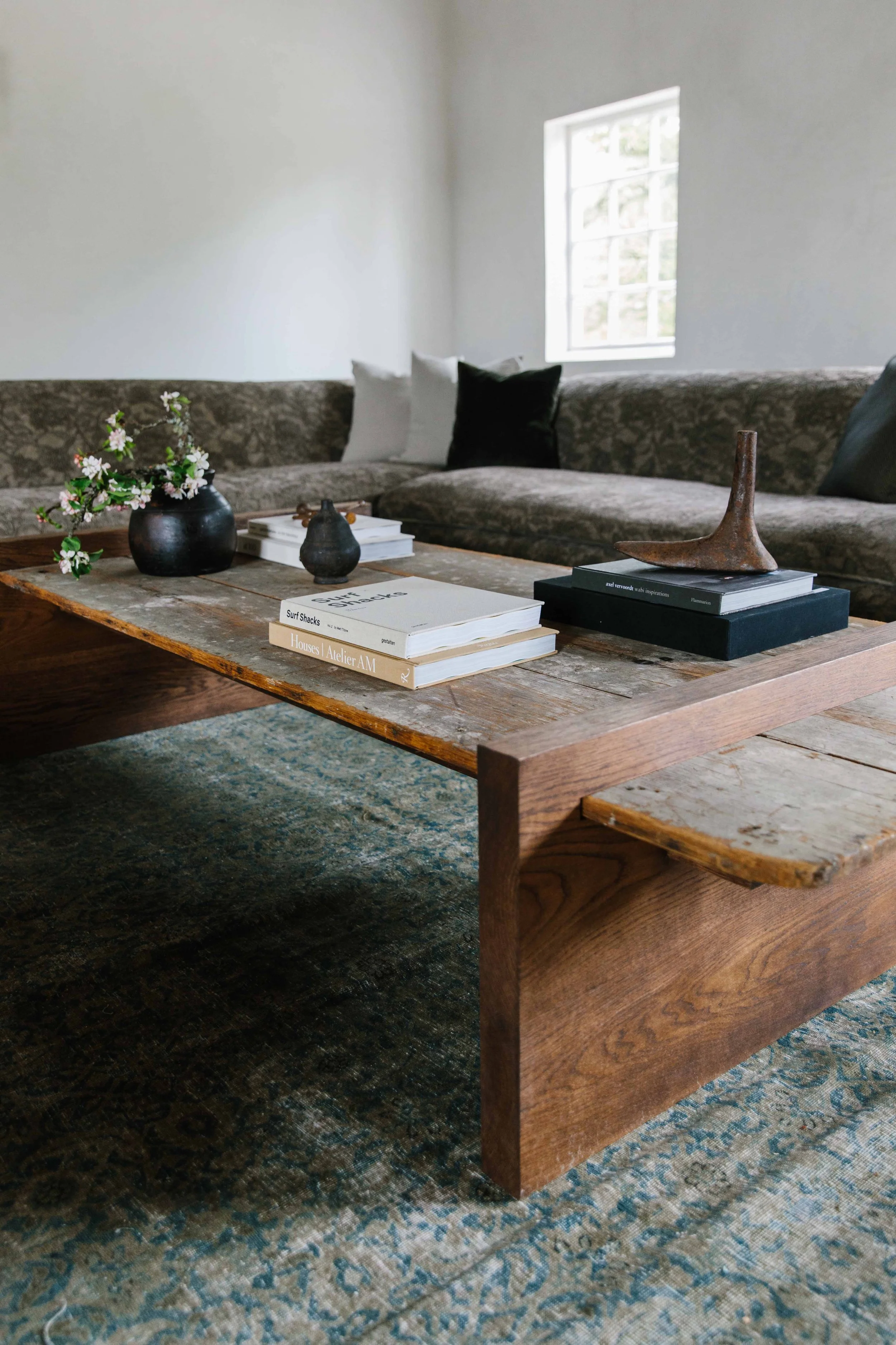 We found this wide-planked table with the most incredible patina and we immediately knew it needed to live in Coasters’ Chance. Obviously, we wanted an equally massive coffee table to go with the sectional, so we added two modern feeling legs with perfectly placed cut-outs so that the table actually slides into them on either end. This gave way to a sleek design without any exposed screws or weird joint plate-supports. Japanese designers are masters of this kind of table construction, and it has a very worn-in feeling, so we named this piece the Sabi Coffee Table. If you’re in love, you’re in luck because a very limited number of these (two to be exact) are available on our e-commerce shop! You can actually find many of our custom-made pieces there too, so we’ll let you know when it goes live.