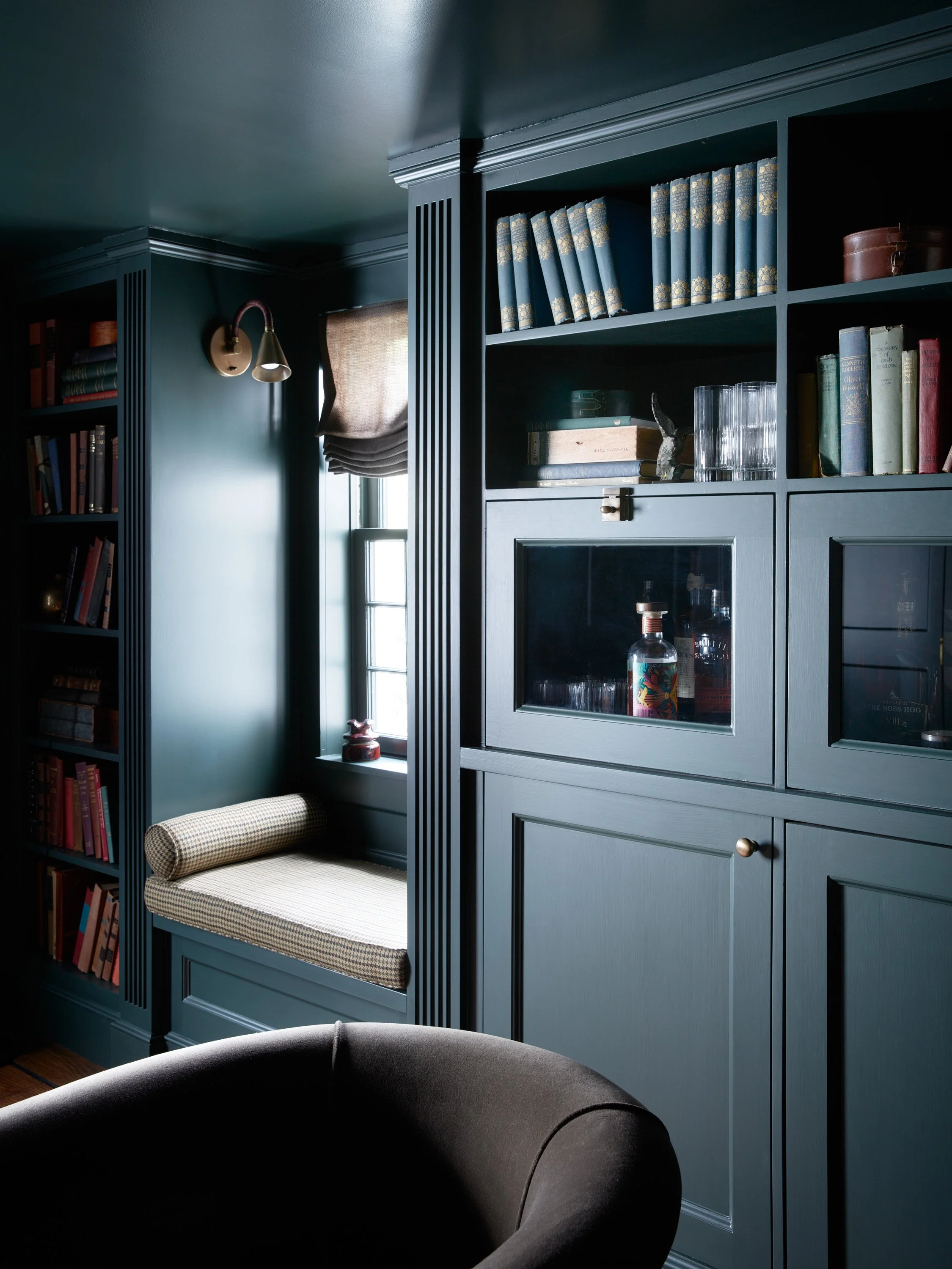 At the far wall, what first appears to be a built-in bookshelf reveals itself as a hidden bar, a folding panel that lowers to unveil glassware, decanters, and a collection of rare spirits. The bar’s surface, finished in hand-polished lacquer, reflects the warm gleam of brass and copper from a vintage mid-century pendant that hangs above the room’s center. Nearby, a window bench upholstered in Design of the Times fabric is a nice pause, a place to sip, read, or reflect. The shelving above is lined with worn, gilt-spined books, collected over time from local antiquarians, grounding the space in a sense of heritage and intellectual gravitas. Every material, leather, brass, wool, and oak, was chosen for its permanence, its ability to patina beautifully with age.