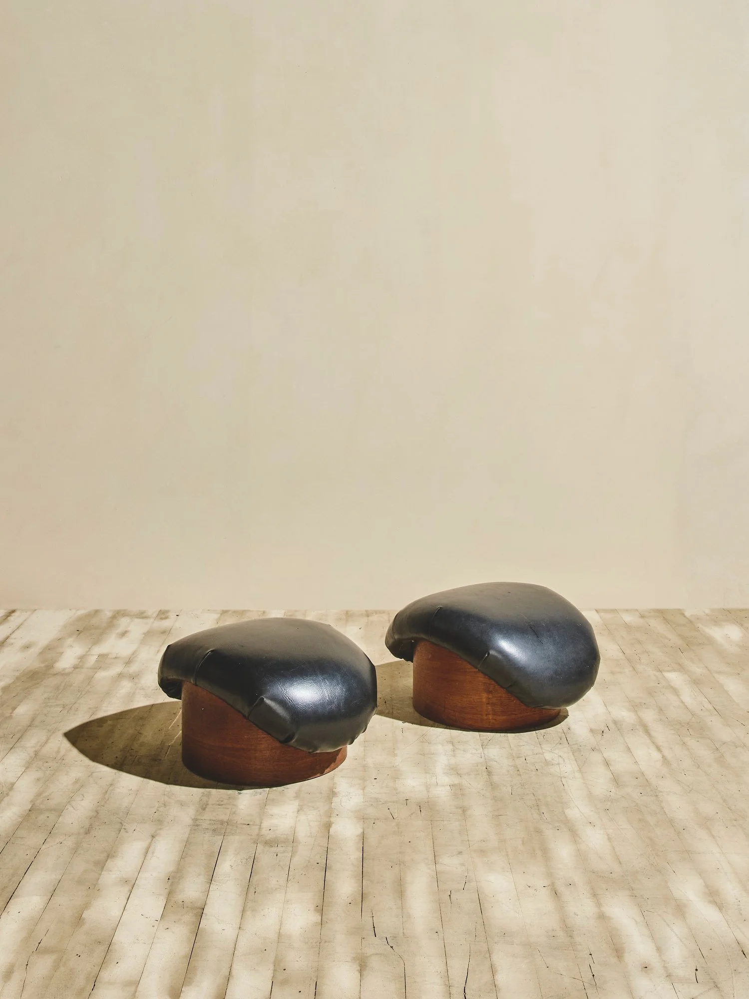 Pair of Sculptural Leather & Wood Milo Baughman Ottomans
