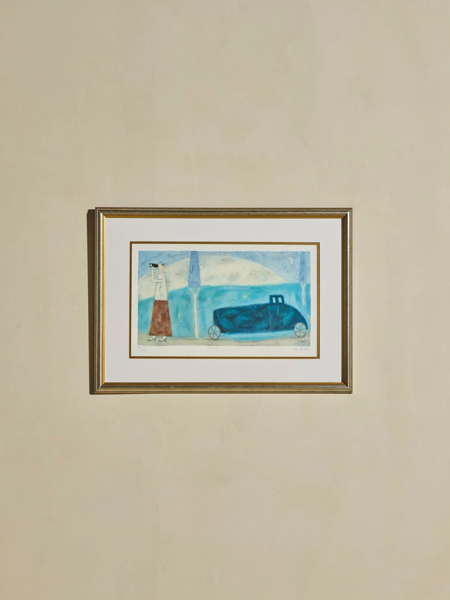 Framed serigraph by Paula McArdle, titled “Watching,” features a whimsical scene rendered in soft shades of blue, aqua, and earth tones. The composition includes a stylized figure and a car placed within a simplified landscape, showcasing McArdle’s signature blend of minimal linework and dreamy color fields. The print is signed, titled, and editioned along the lower margin.