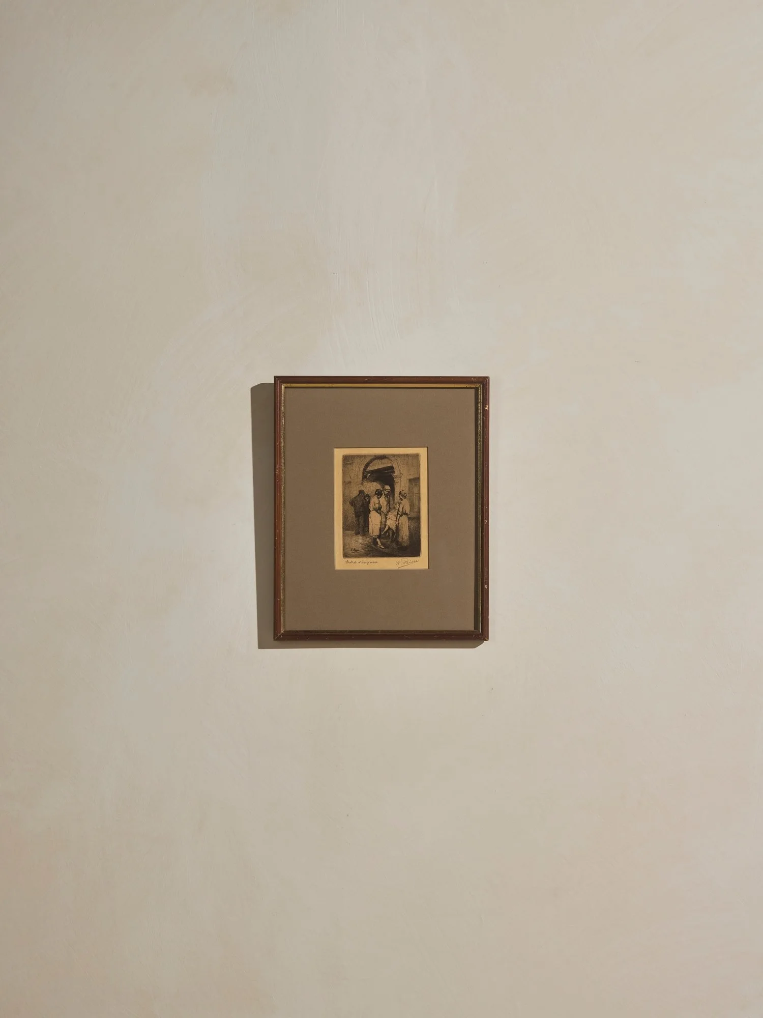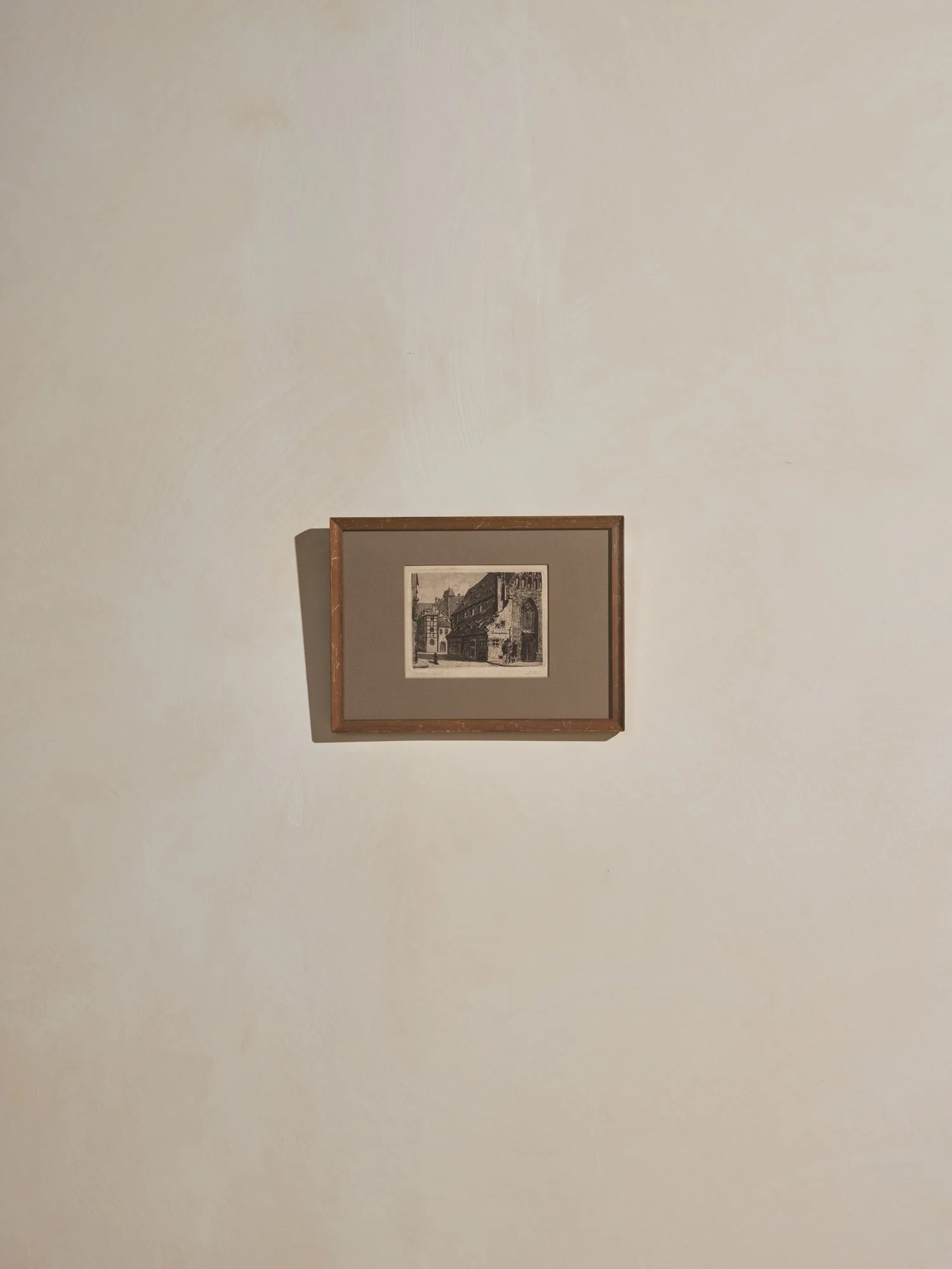 Vintage etching depicting a stand of birch trees rendered with fine linework and soft tonal contrast. The artwork is centered within a wide mat and presented in a wood frame. The etching shows subtle variation and printmaking technique.