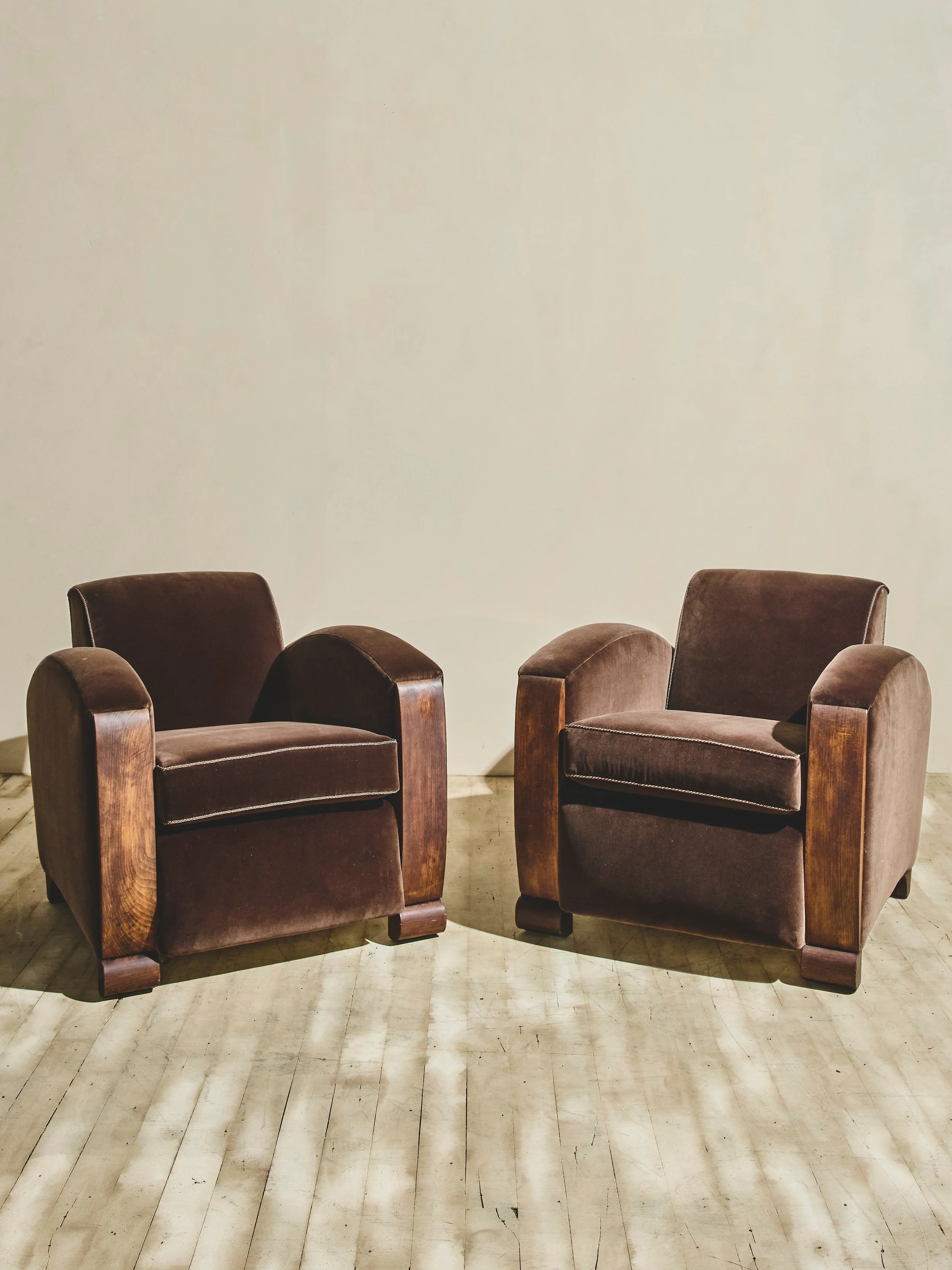 Pair of Vintage Italian Art Deco Club Chairs - Brown Velvet