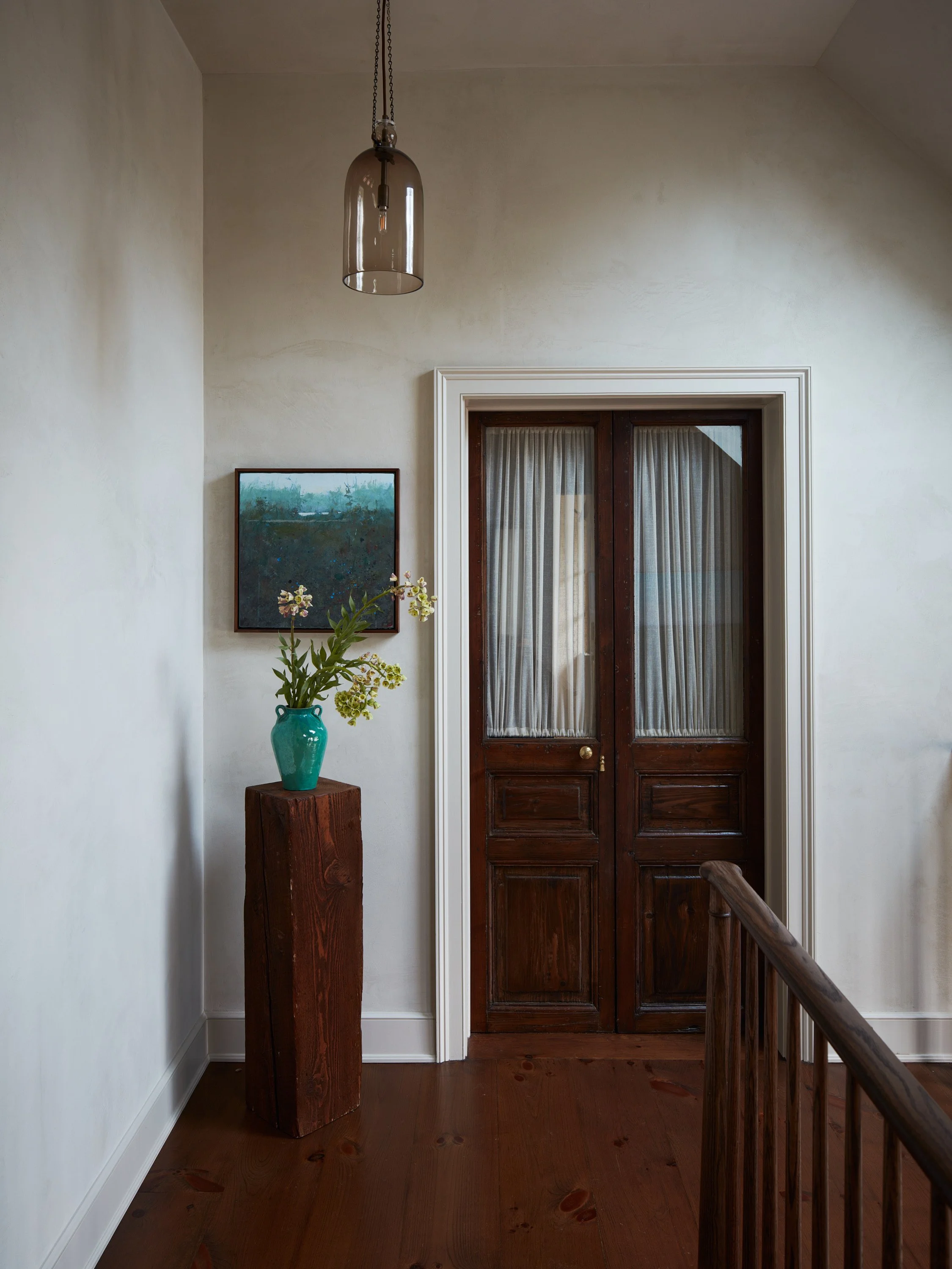Our vision for the main suite was to create a bedroom that felt calm, balanced, and deeply connected to the history of the home, while still reading as modern and livable. We focused on color, materiality, and layout, introducing custom double doors that open to the outdoor deck and allow the bedroom to feel truly lived in and connected to its surroundings.