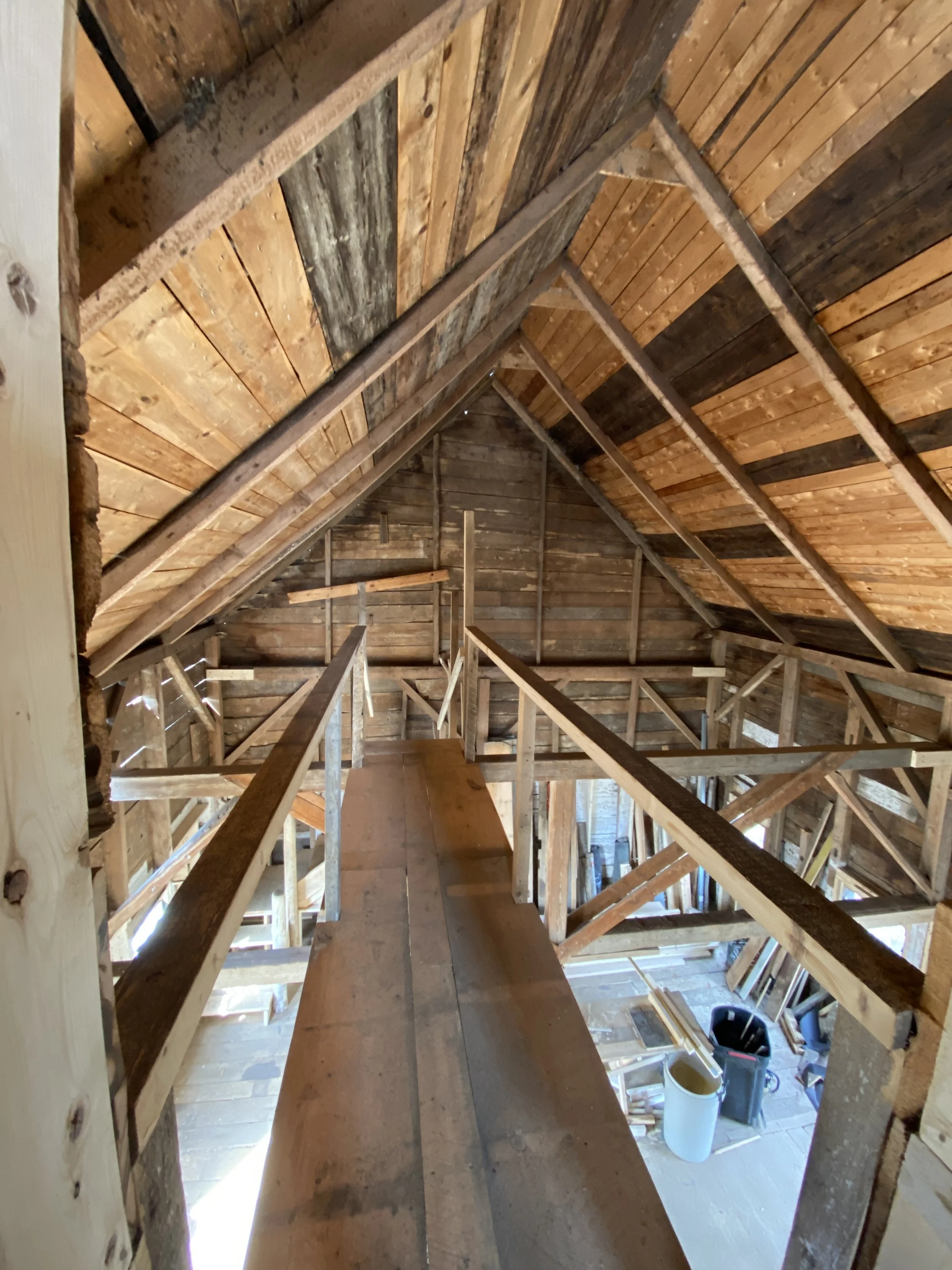 In terms of the reno itself—the barn was really the first point of attack for the project because logistically it was going to be the most difficult and require the most work. The entire foundation was rotted and submerged in mud. In order to begin, the structure had to be jacked up, floor boards removed carefully (because we had to memorize the exact layout as they were the most beautiful wide boards), the existing foundation removed, mud removed, and replaced rotted pillars before we could even get started. This was a mortise and tenon style barn.