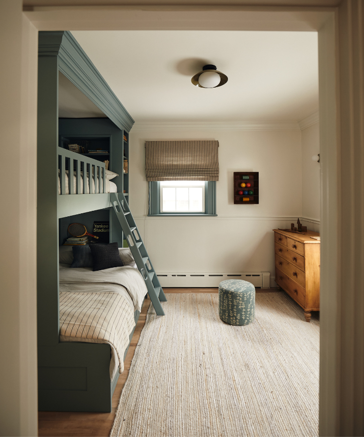 A Kids room is all about playful fun that evokes a sense of curiosity for me. I love this room because, although the house was meant to feel simple, it still allows space for the kids to grow up and be playful. A pop of blue for the bunks is layered with simple patterns, the clients’ beautiful pine dresser, and a few fun lighting moments by In Common With.