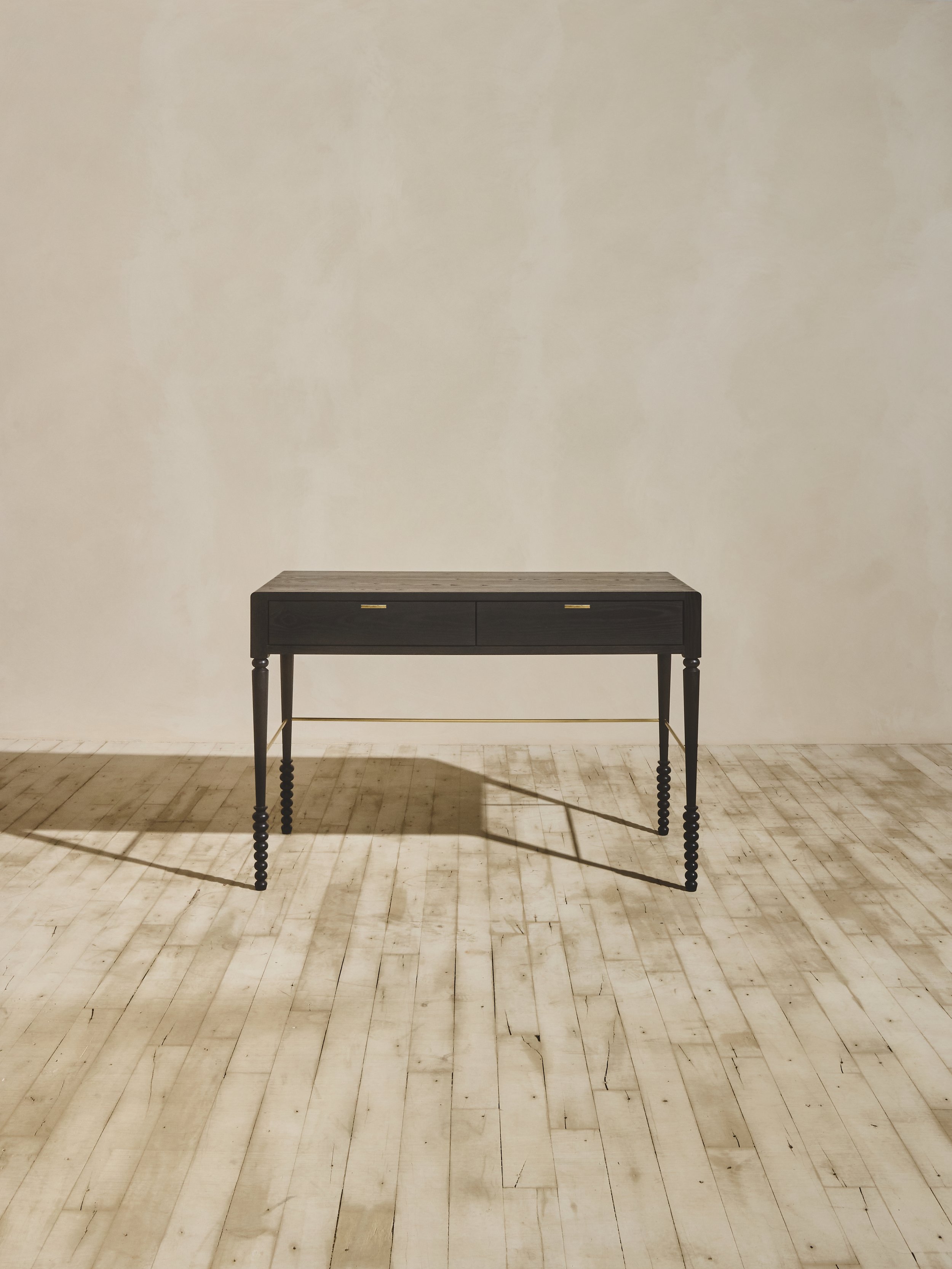 The primary bedroom is intentionally restrained—finished in Farrow & Ball’s Mouse’s Back and layered with vintage textiles and a ROWEAM Disc Desk.