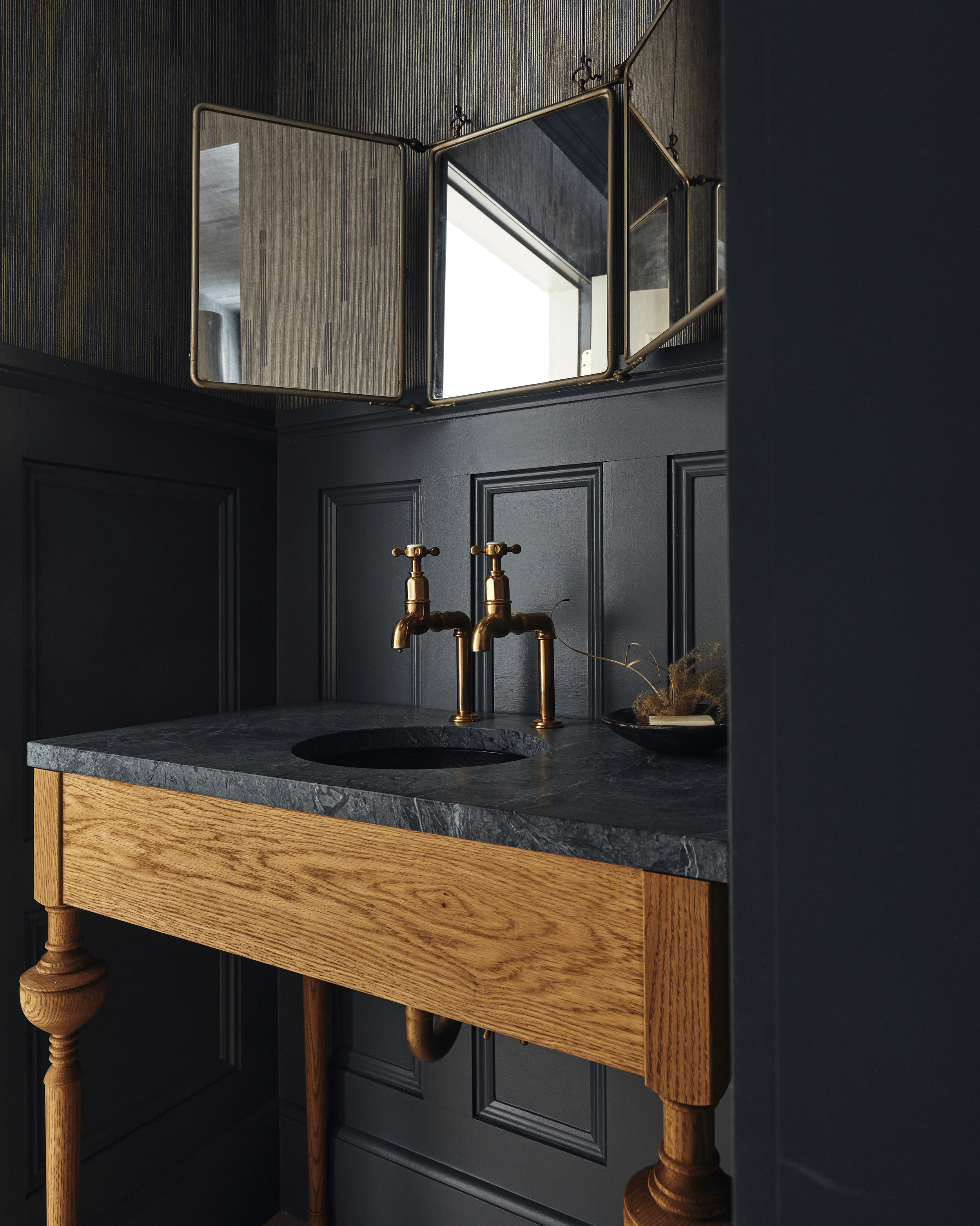 The walls are wrapped in Farrow & Ball’s Railings layered with Fayce Tailor grasscloth, creating depth and richness. A custom Acorn vanity from ROWEAM anchors the space, paired with a sculptural Workstead sconce wrapped in matching material.