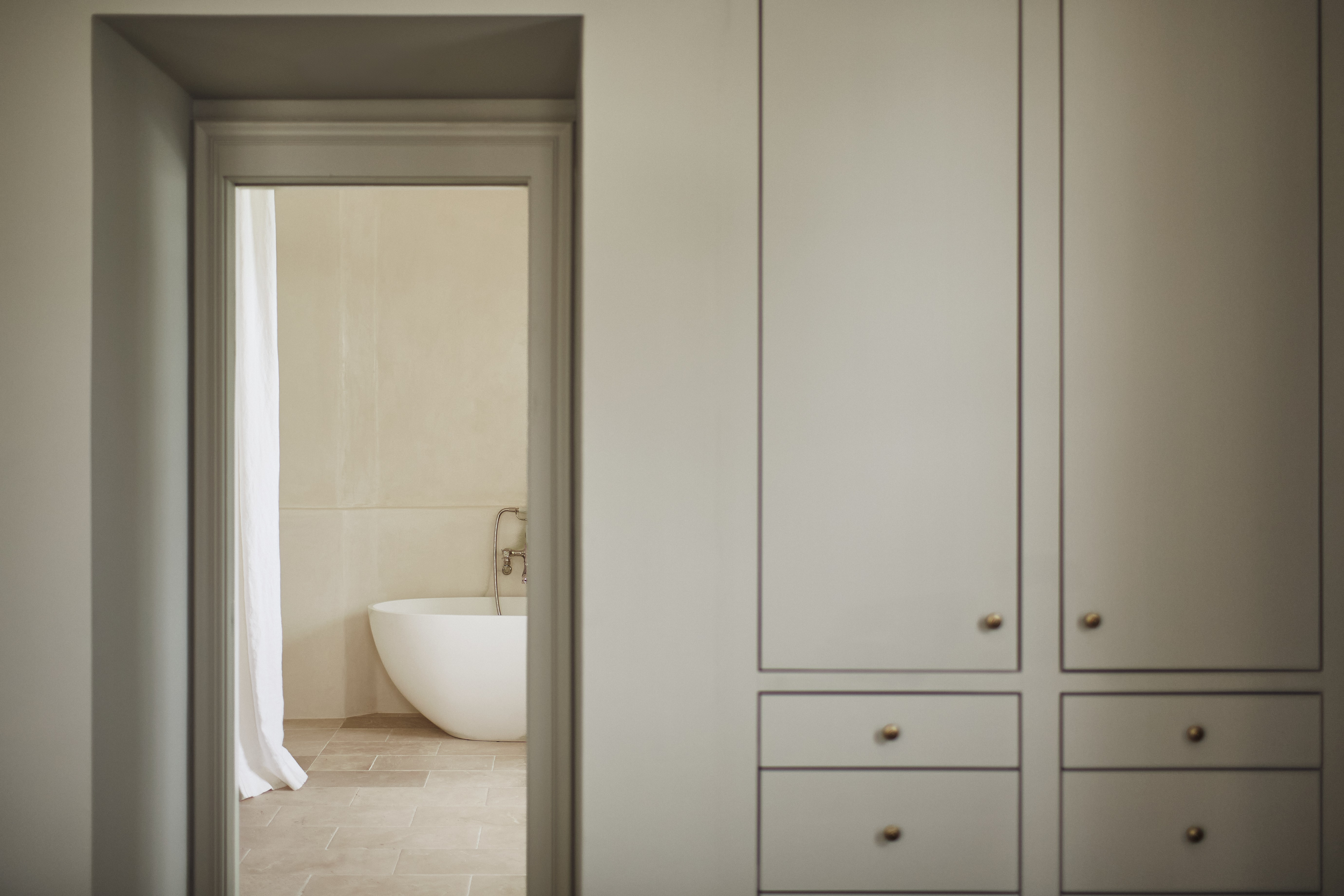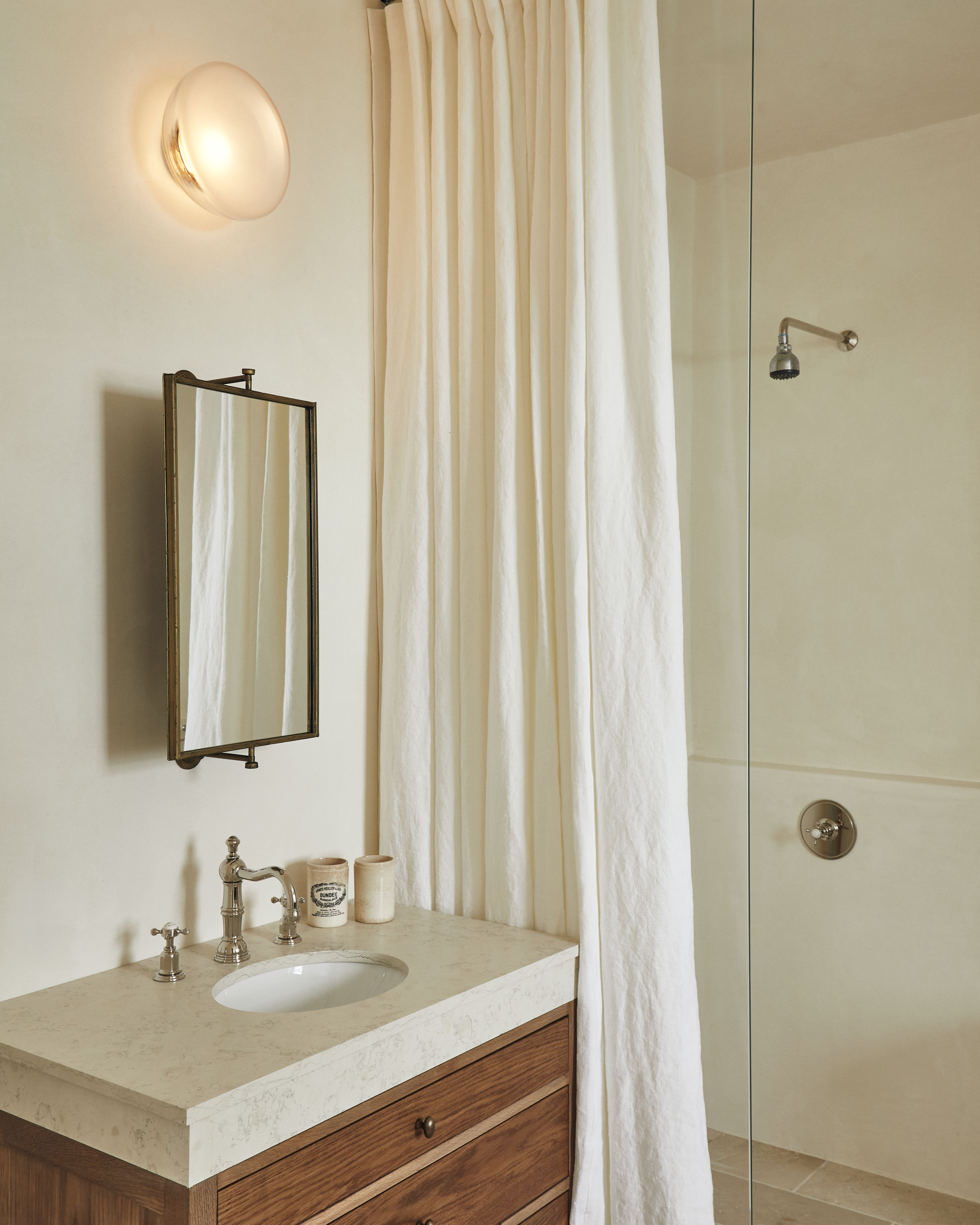 Walls are finished in custom tadelakt, paired with reclaimed limestone flooring sourced from France.Showers are tucked discreetly to either side, softened with inset linen curtains made in Latvia—one of my favorite details—protected behind glass partitions to balance function and beauty.