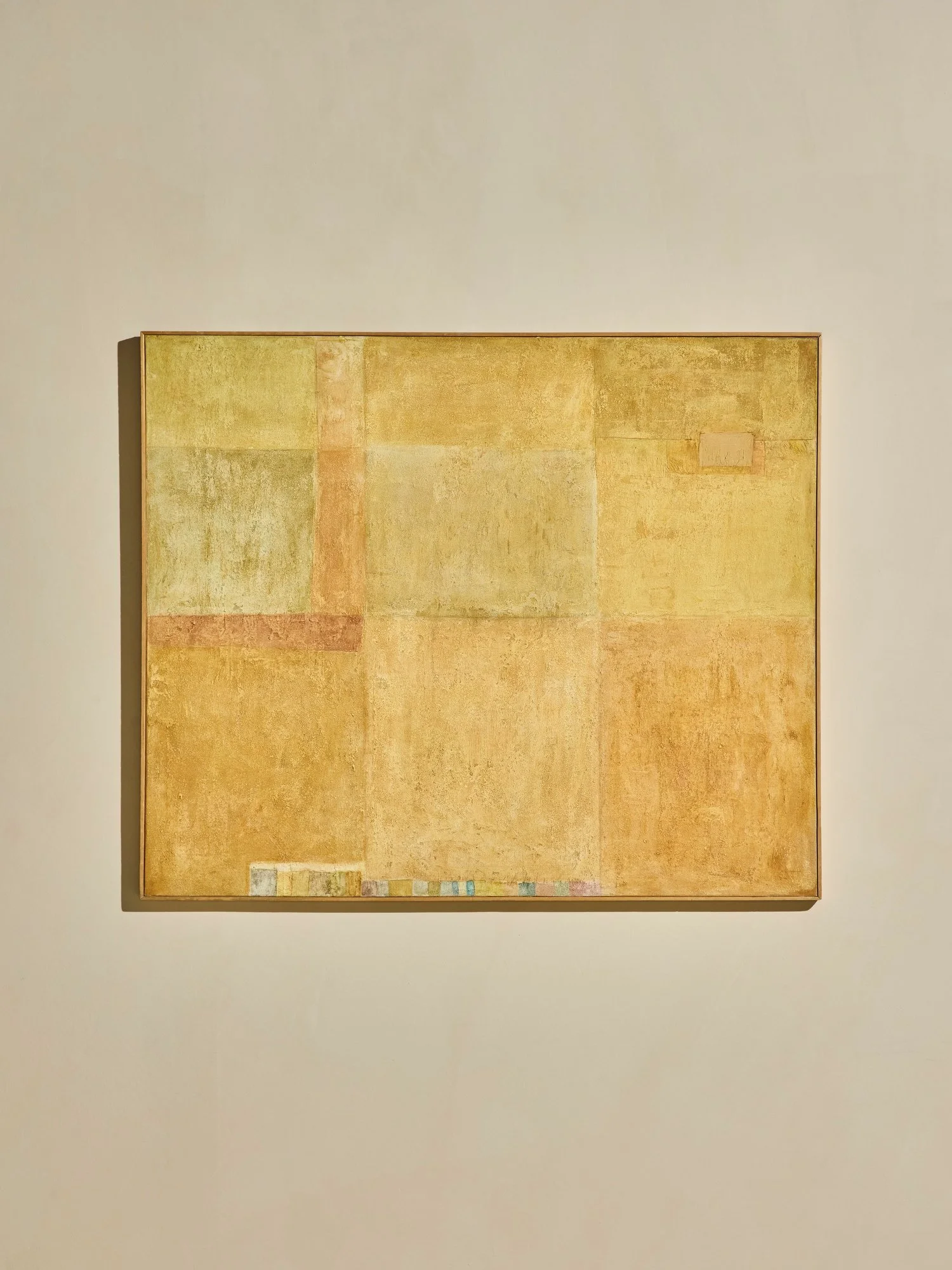 A large abstract painting in soft, sun-washed tones of ochre, sand, and blush. Composed of layered blocks and subtle textures, the piece brings warmth and balance with a quiet, modern feel.
