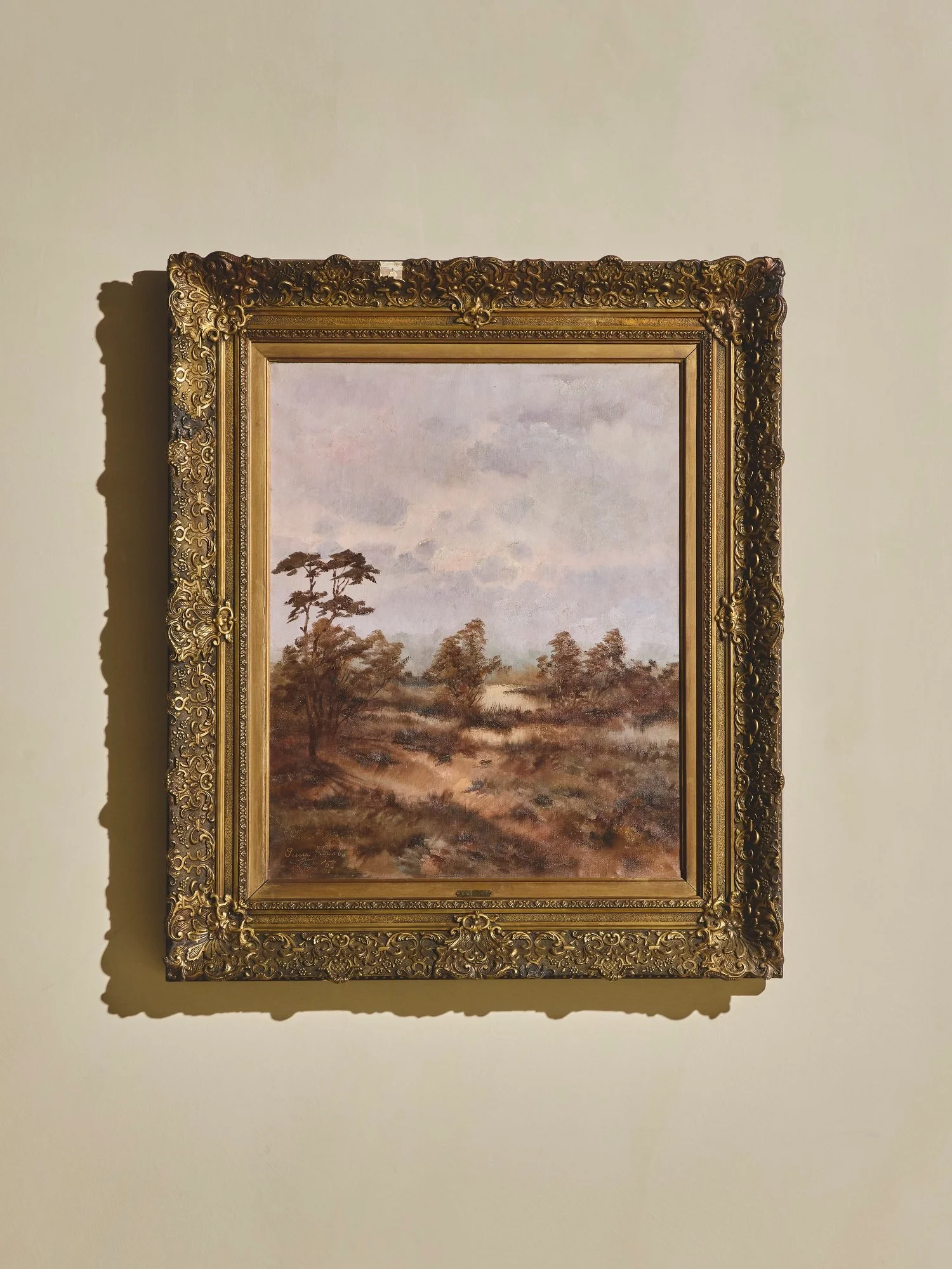 A classic landscape painting depicting a quiet countryside path surrounded by trees under a soft, clouded sky. Rendered in gentle earth tones and muted pastels, the scene evokes calm and stillness.Pierre Jacobs (Dutch, 1916-1963), Country landscape, signed and dated lower left. Provenance: Property from an 875 Park Ave Penthouse Set in an ornate gold frame with detailed carvings.