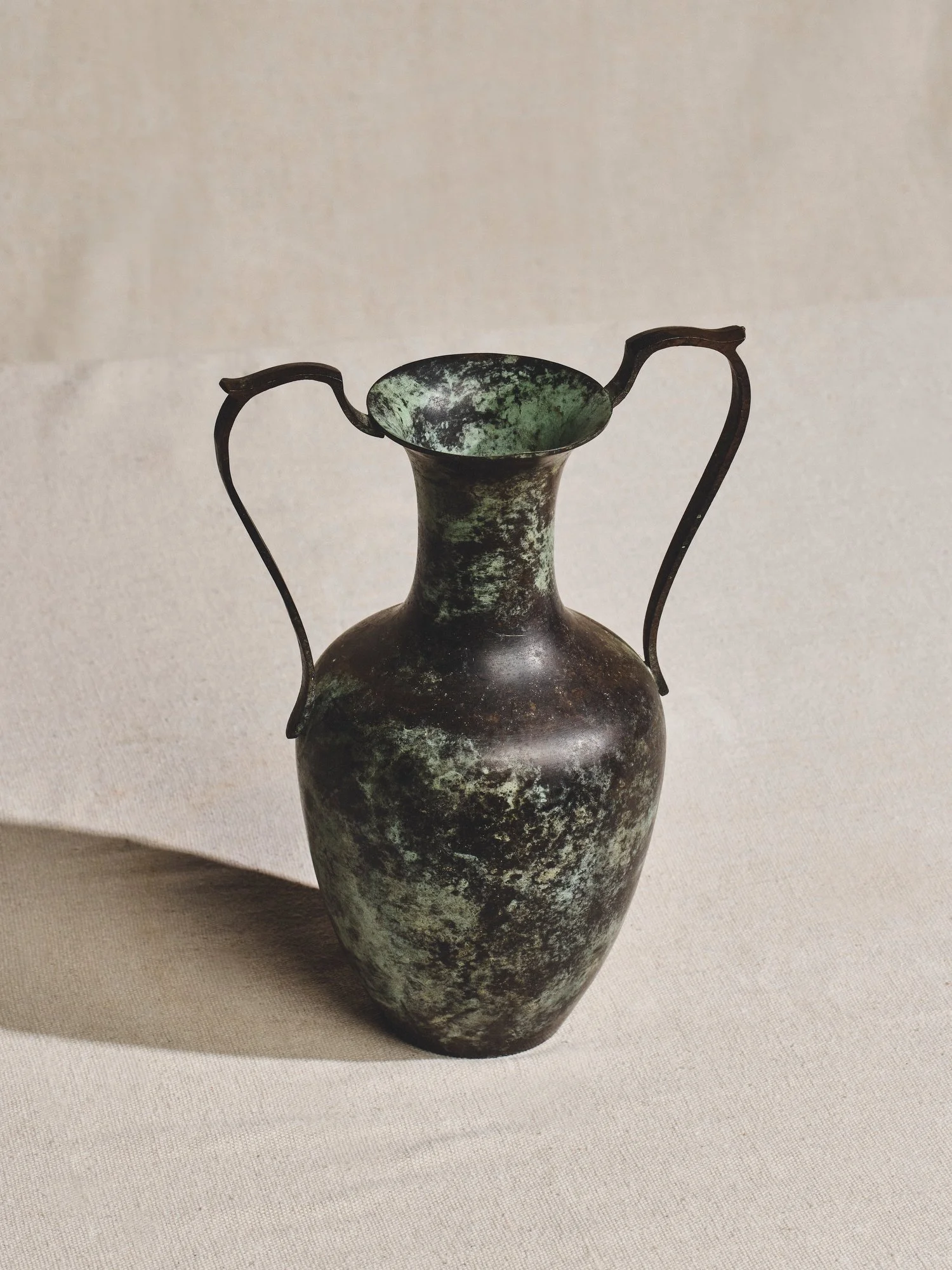 This true vintage urn-style vase features a rounded form and softly flared lip, finished in a rich verdigris patina with green and bronze undertones. Its aged surface brings depth and character, making it a striking decorative accent on its own or as part of a collected vignette.