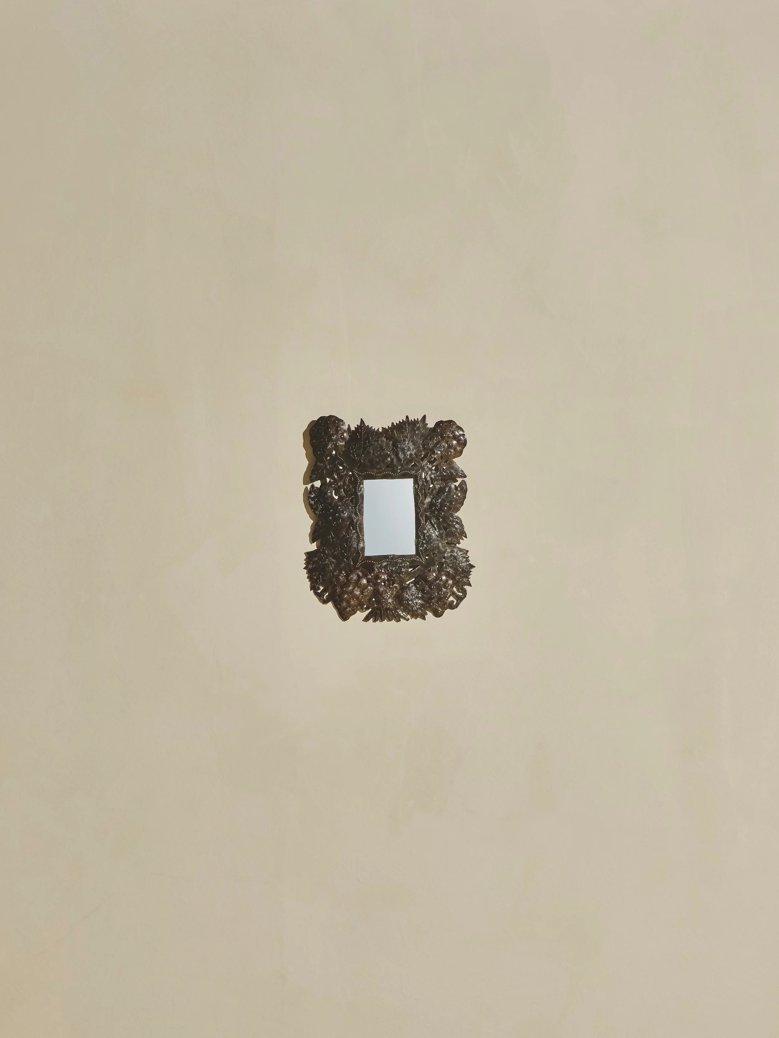 A leaf motif mirror to introduce themes of nature, cyclical life, and symbolic reflection, softly grounding the collection in organic rhythm and renewal.