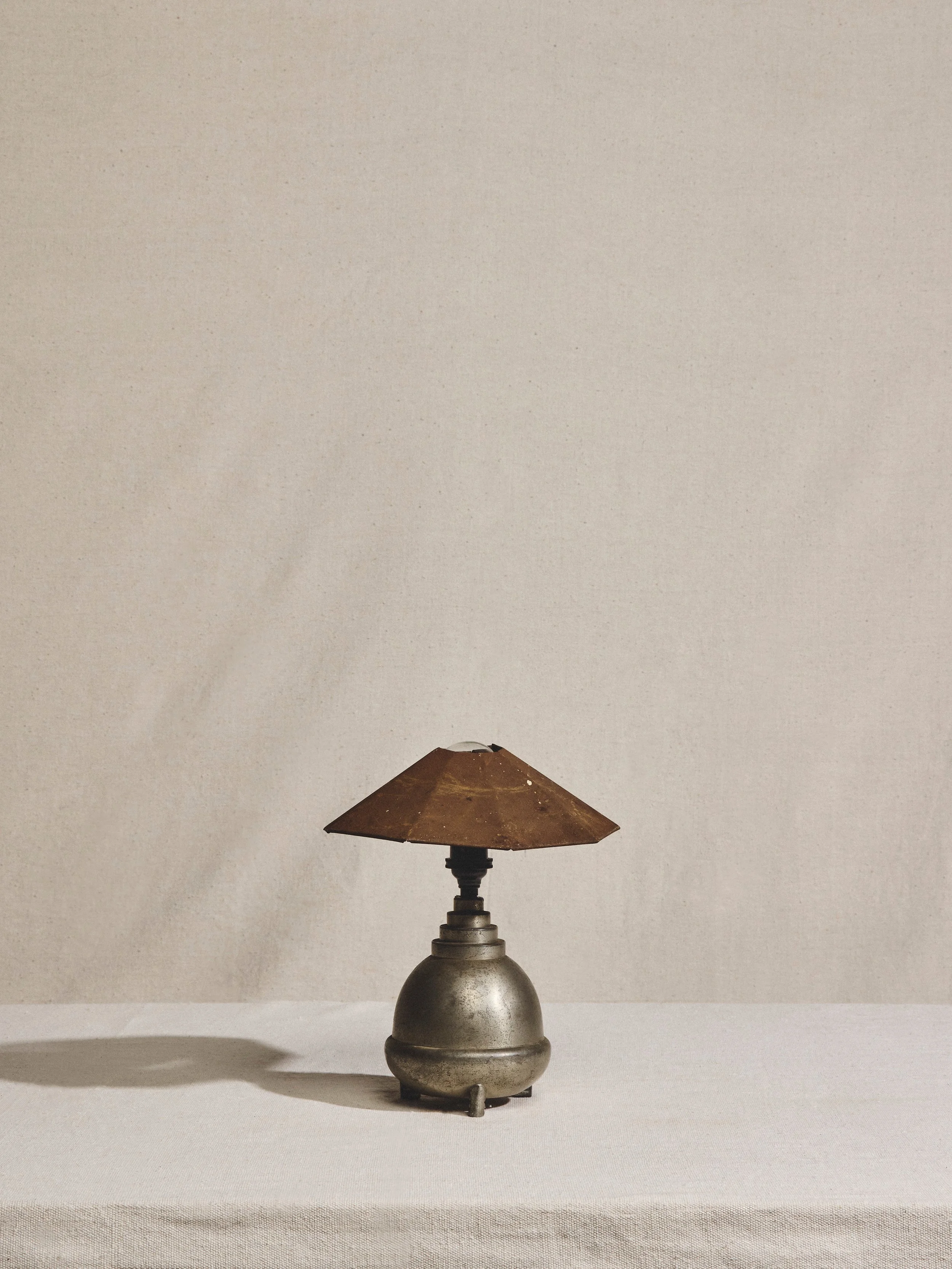 Metal table lamp with a rounded, weighted base and faceted metal shade. Features a naturally aged patina with visible wear and tonal variation consistent with age. Compact sculptural form with clean, utilitarian lines characteristic of mid-20th-century Dutch design. Wear consistent with age.