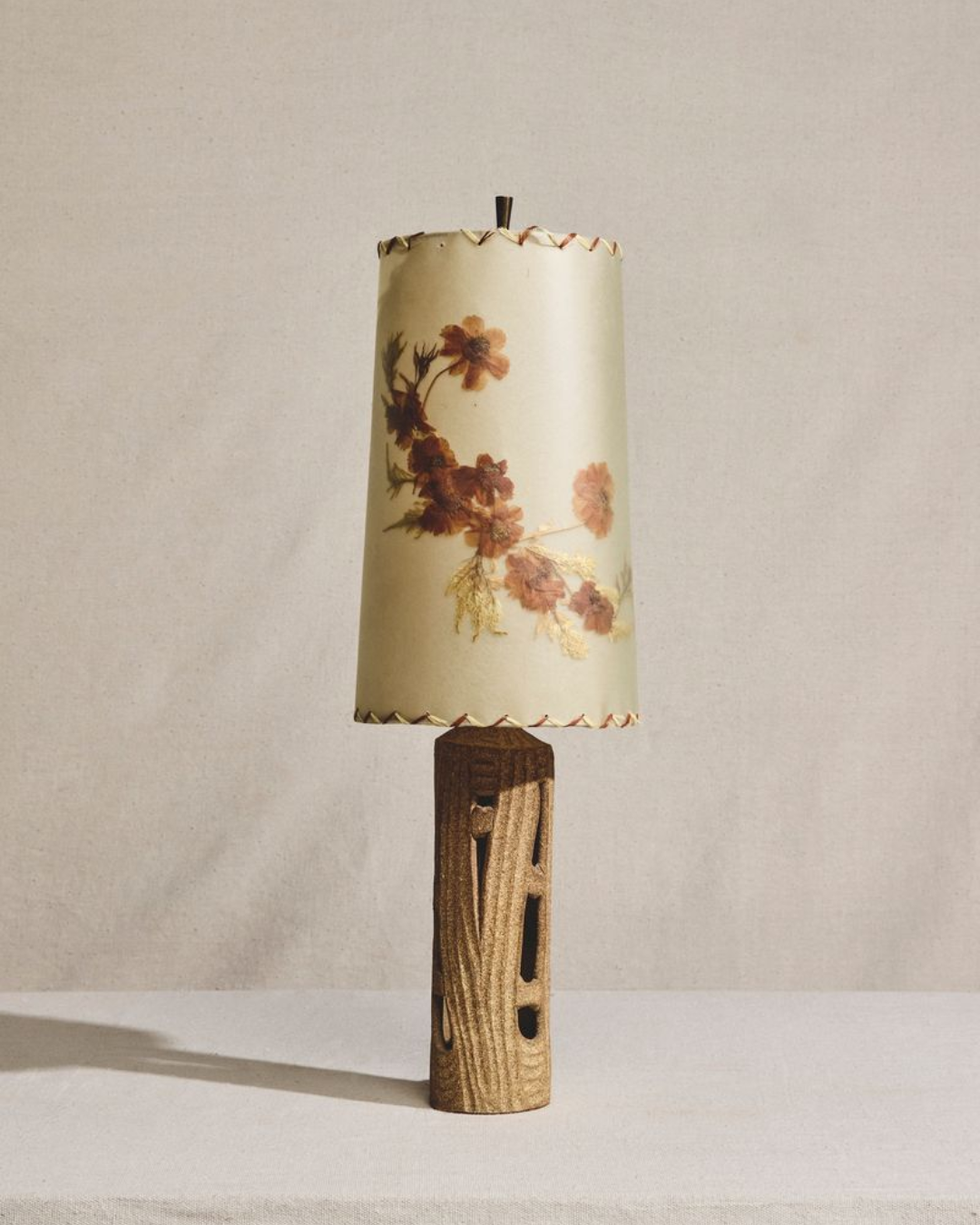 Mid Century Modern table lamp featuring a hand-carved ceramic base with a textured, geometric surface and natural tonal variation. Paired with a cylindrical fabric shade decorated with a floral motif and finished with stitched edging along the top and bottom. Wear consistent with age.
