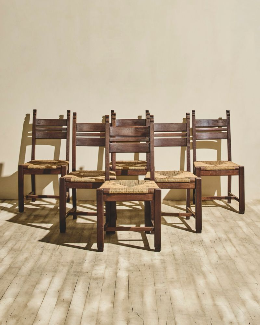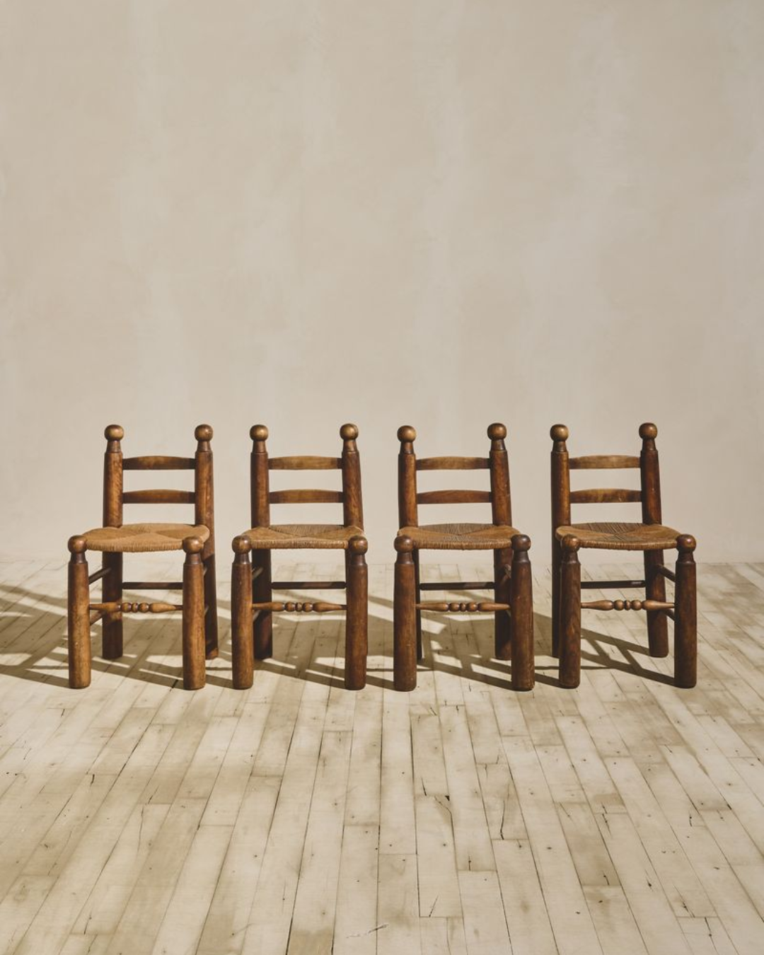 French ladder-back chairs and Charles Dudouyt dining chairs reflect regional craftsmanship and Brutalist honesty, anchoring dining spaces in utility, proportion, and history.