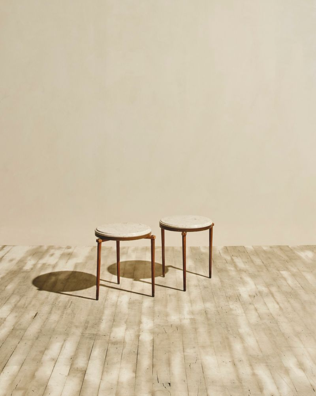 Set of two travertine side tables featuring circular stone tops supported by slender tripod legs. The natural travertine surfaces display subtle tonal variation, organic veining, and textural irregularities inherent to the stone. Minimalist three-leg base. Wear consistent with age.