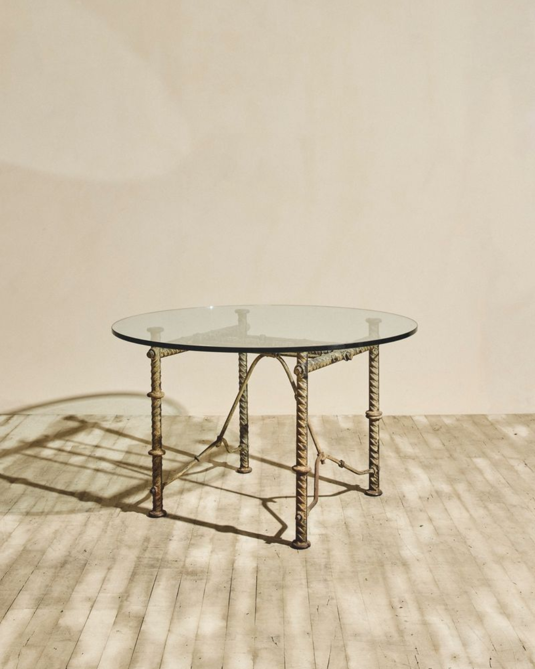 Dining table designed by Ilana Goor featuring a sculptural wrought iron base with twisted and textured detailing. The base supports a round glass tabletop, allowing the intricate ironwork to remain visible from all angles. The iron shows natural patina and tonal variation. Wear Consistent with age.