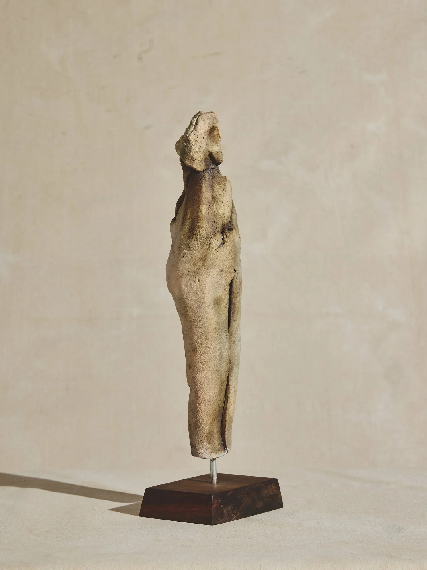 Abstract figure on a wood pedestal, artist OZwaig. This ceramic sculpture with a rough resin finish shines in color and shape. At first glance, one figure is seen, slightly rotating the sculpture, and it would appear two figures are embraced. A subjective interpretation for a true collector. — Abstract Figure, sourced by ROWEAM.