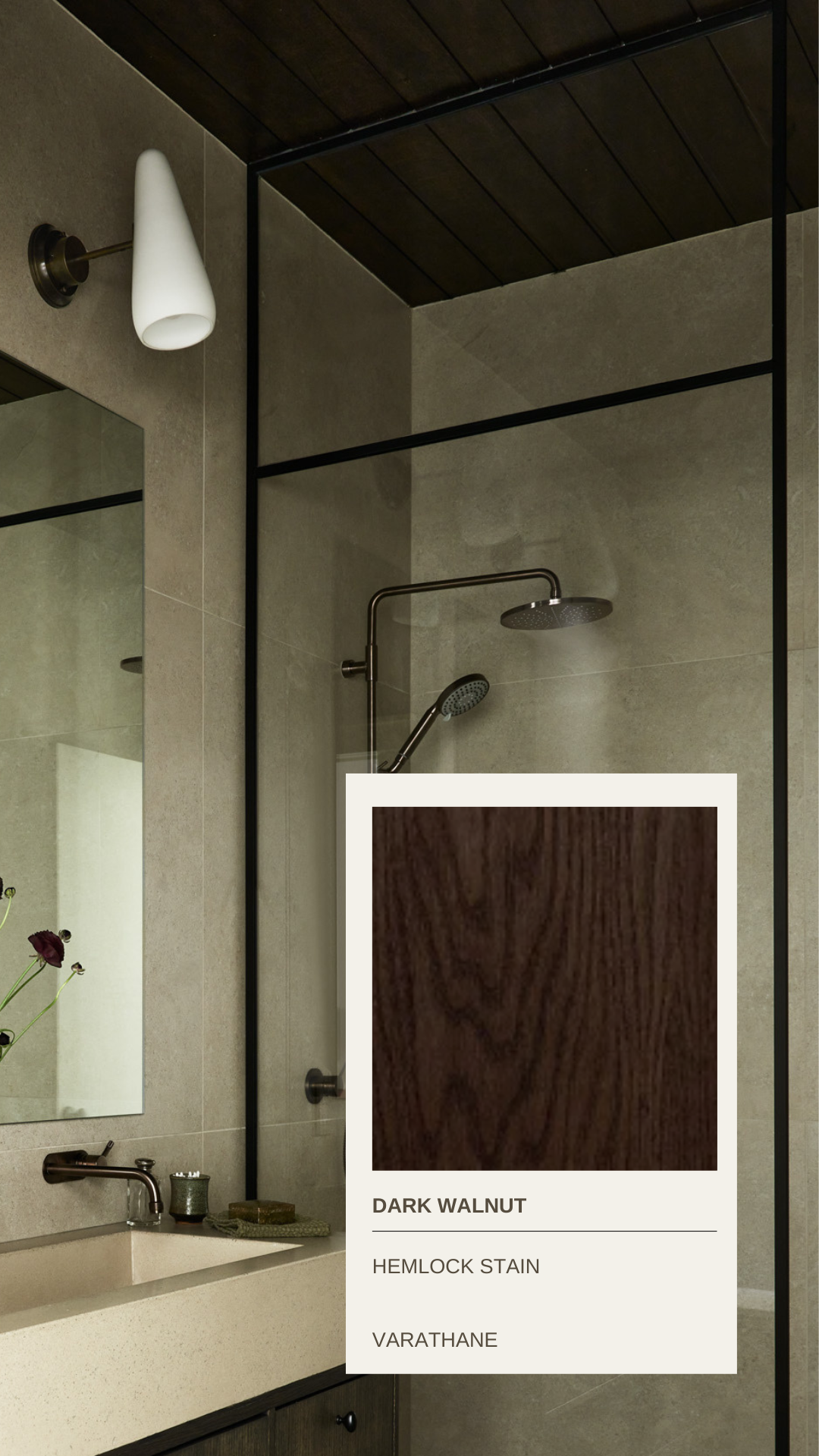 There is a smaller bathroom located on the main floor that serves the entire living space on the first floor, as well as the bedrooms located on the floor above. I particularly enjoy having one bathroom that reflects our signature broody style. Recently, I came across some vintage stone tiles from Paris that have a beautiful marble veining. The tiles are slightly ballooned in the center, which creates a subtle movement towards the grout lines. The color is a perfect gray, almost resembling the color of an elephant's breath.