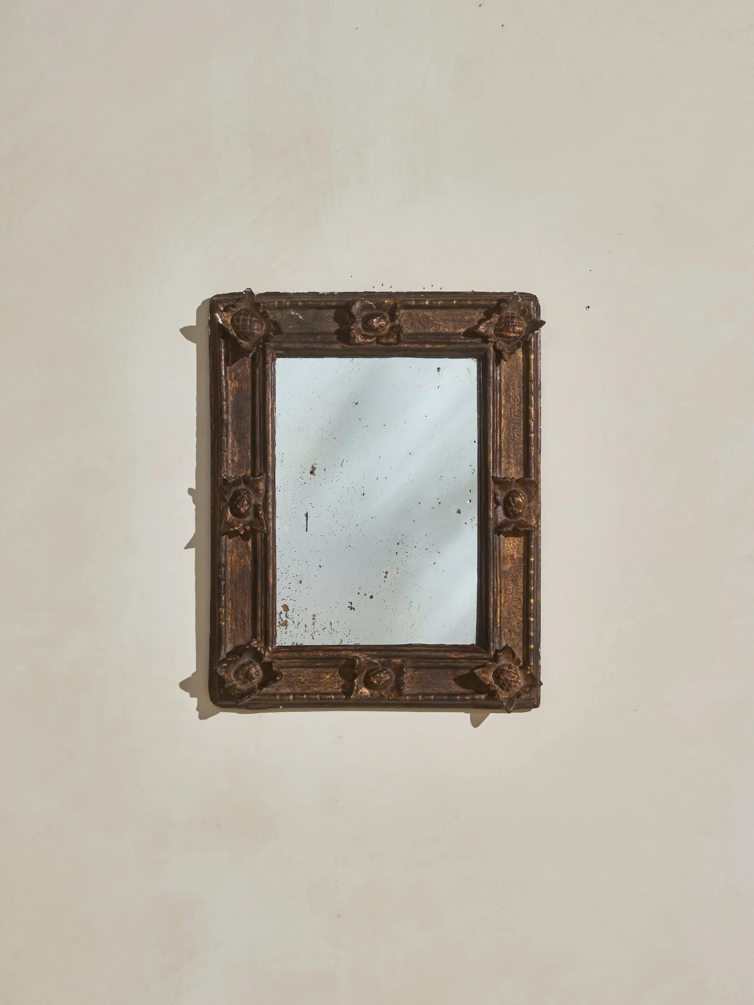 Ornate 18th Century Barcelona Mirror with engraved border reliefs and applied wooden floral carvings. Distressed mirror. Intended for vertical hanging orientation. — Ornate Barcelona Mirror sourced by ROWEAM